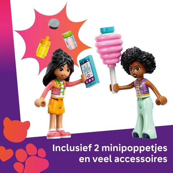 LEGO Friends Suikerspinkraam en scooter (42643) set. De set bevat 2 LEGO Friends minipoppetjes plus een bouwbare mobiele eetkraam scooter mascotte en accessoires.Meisjes jongens en kleine bouwers die van creatief spelen houden kunnen hun eigen verhalen verzinnen met deze set. Liann en Jamila brengen graag samen tijd door bij de suikerspinkraam. Het LEGO voertuig kan de kraam voorttrekken en er zijn een kom en toppings om de suikerspinnen te maken. Er is ook een kassa en geld zodat kinderen verschillende interacties met klanten kunnen naspelen.Bekijk ook ander creatief bouw voor kinderen in het LEGO Friends universum met nog veel meer vriendschapsverhalen om te ontdekken (apart verkrijgbaar). Download de LEGO Builder app voor intuïtief bouwplezier. Hiermee kunnen kinderen inzoomen en modellen in 3D draaien sets opslaan en hun voortgang bijhouden.