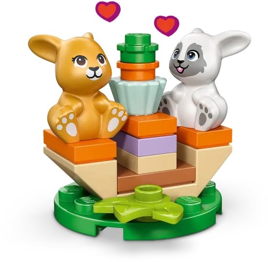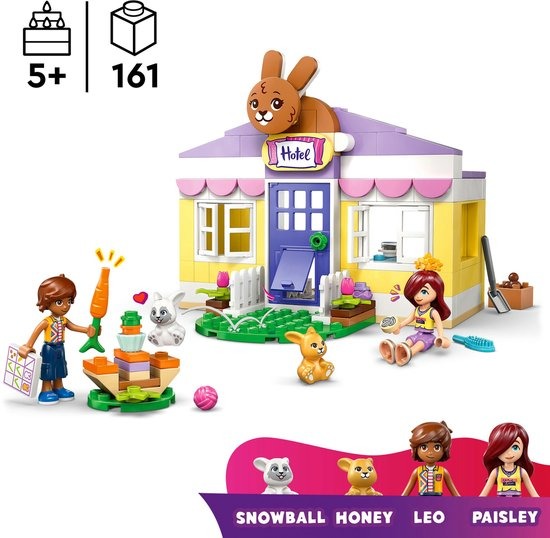 LEGO® Friends Heartlake City konijnenhotel (42679) speelgoed voor meisjes en jongens vanaf 5 jaar. Dit fanatasiespeelgoed bevat 2 minipoppetjes en 2 speelgoedkonijntjes, waarmee kinderen verhalen over het verzorgen van dieren kunnen vertellen. Deze schattige set zit vol leuke details, zoals het speciale konijnenluik en het grappige uithangbord. Binnen vind je een wortelvormig tapijt, een slaapgedeelte en een lijst om de konijntjes in- en uit te checken bij het hotel. Buiten is een zitgedeelte voor de konijnen, waar ze samen kunnen genieten van een wortelcupcake. Andere accessoires inspireren kinderen om voor de huisdieren te zorgen: een borstel, een bolletje wol, voer en water en een schep om de konijnenpoep op te ruimen. Deze set is een geweldig cadeau voor meisjes en jongens die van dieren houden. Met de LEGO Builder app beleven kinderen een intuïtief bouwavontuur: ze kunnen inzoomen en draaien met behulp van 3D-bouwinstructies, sets opslaan en hun voortgang bijhouden. De set bevat 161 onderdelen. KONIJNENHOTEL – huppel naar de leukste verhalen met dit konijnenspeelgoed voor meisjes, jongens en dierenliefhebbers vanaf 5 jaar, inclusief 2 minipoppetjes, 2 konijnen en accessoires met wortelthema LEUKE KENMERKEN – bouw en verken het gedetailleerde konijnenhotel met een dierenluik, een slaapgedeelte voor de konijnen en diverse schattige details, waaronder een tapijt in de vorm van een wortel 2 LEGO® FRIENDS PERSONAGES – dit LEGO® Friends Heartlake City konijnenhotel (42679) speelgoed wordt geleverd met 2 minipoppetjes van Paisley en Leo, plus 2 dierenfiguren om de fantasie te prikkelen ACCESSOIRES VOOR DE KONIJNEN – bevat veel speelgoedaccessoires om voor de dieren te zorgen, zoals een borstel, een bolletje wol, een wortelcupcake, voer en water en een schep om de konijnenpoep op te ruimen CADEAUTIP – deze speelset is een leuk cadeau voor dierenliefhebbers die graag hun eigen verhalen verzinnen met speelgoed om mee te doen alsof ONLINE SERIE – ontdek meer creatieve speelideeën in de andere sets (apart verkrijgbaar) en de online serie LEGO® Friends: Een Nieuw Hoofdstuk, waarin kinderen kennismaken met de personages uit Heartlake City DIGITALE BOUWINSTRUCTIES – de LEGO® Builder app begeleidt kinderen op een digitaal bouwavontuur waarmee ze kunnen inzoomen, sets kunnen draaien met behulp van 3D-instructies en hun voortgang kunnen opslaan en bijhouden AFMETINGEN – een 161-delige set met een model van ca. 11 cm hoog, 13 cm breed en 12 cm diep KONIJNENHOTEL – duik in speelse verhalen met het LEGO Friends Heartlake City konijnenhotel bouwpakket voor kinderen vanaf 5 jaar, inclusief 2 Friends poppetjes en 2 dieren figuren