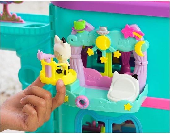 Gabby's Poppenhuis Pandy Paws-speelset met sterrenwachtbalkon. De set bevat een Pandy Poek-speelgoedfiguur van 6,3 cm, poppenhuismeubels en 6 poppenhuisaccessoires, waaronder een telescoop en balkonbedeltjes. Hang het balkon aan de ramen van het poppenhuis en maak je surprise box open om het verrassingsspeeltje te onthullen: een donutbedeltje. Scan de QR-code in de surprise box om een speciale beloning te ontgrendelen in de gratis Gabby's Dollhouse-app, beschikbaar voor iOS en Android. Gabby's Dollhouse-speelgoed voor meisjes en jongens is geweldig om cadeau te doen aan kinderen die fan zijn van de populaire Netflix-serie en graag poppenhuiswerelden bouwen. Maak hun eerste kennismaking met een poppenhuis onvergetelijk met een wereld vol schattige speelgoedfiguren, accessoires voor het poppenhuis en meubels om te verzamelen en neer te zetten. Breid je wereld uit met onderdelen als een speelkeuken of een muziekkamer, en verzamel talloze items, zoals een geweldig speelgoedcruiseschip, een zeemeerminzwembad, de gloednieuwe feestkamerspeelset (een poppenhuiszolder met een skatepark) en superschattige balkons met minifidgetspeeltjes, die leuk zintuiglijk spel bieden en naadloos te combineren zijn met beide versies van het poppenhuis.